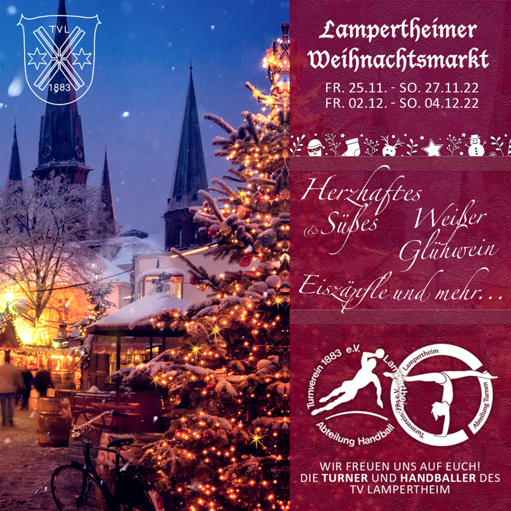 Die Abteilungen Handball und Turnen des TVL nehmen erstmalig mit einem gemeinsamen Stand am Weihnachtsmarkt der Stadt Lampertheim teil, welcher am ersten und zweiten Adventswochenende rund um die Domwiese stattfindet.